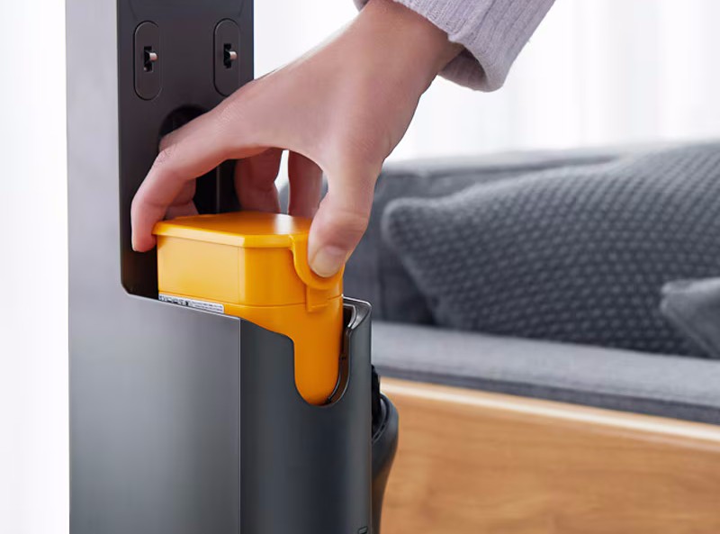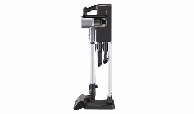 Prva stvar koja nam se kod ovog usisivača svidela je što poseduje samostojeći nosač, koji ne mora da se kači na zid. To znači da ne morate da bušite zid da biste „okačili“ usisivač za punjenje, kao i da taj nosač možete da pomerate po kući, ako za tim postoji potreba. Zgodno je što ga možete držati uspravno, ili položeno, na podu. Osim što se koristi za odlaganje usisivača, ovaj nosač je istovremeno i punjač baterija, a služi i za odlaganje dodatnih nastavaka. Postavljanjem usisivača u ležište, automatski će se aktivirati punjenje baterije.