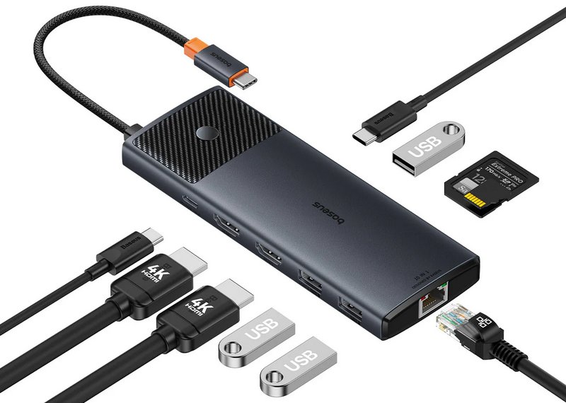 Baseus Metal Gleam Series II 10-in-1 USB Hub efikasno rešava sve te probleme. Kao što se iz imena može zaključiti, radi se o USB habu sa 10 portova koji će zadovoljiti sve potrebe, čak i najzahtevnijih korisnika. Uređaj poseduje USB-C kabl dužine dvadesetak centimetara za povezivanje sa računarom, dok mu je kućište napravljeno od metala, sa završnom obradom koja ne ostavlja otiske prstiju. Na raspolaganju su sledeći portovi: tri USB-A, dva USB-C, dva HDMI, SD, MicroSD slotovi, kao i mrežni RJ45 port.