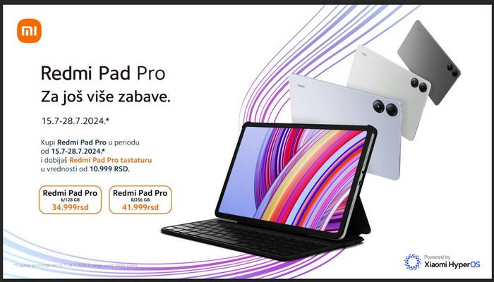 Redmi Pad Pro je dostupan u Graphite Gray, Mint Green i Ocean Blue bojama, a cena za Redmi Pad 6/ 128GB iznosi 34.999rsd, dok je cena za Redmi Pad 8/256GB 41.999rsd. U periodu od 15.7-28.7.2024 ili do isteka zaliha, uz svaki kupljeni tablet dobijate i Redmi Pad Pro keyboard.