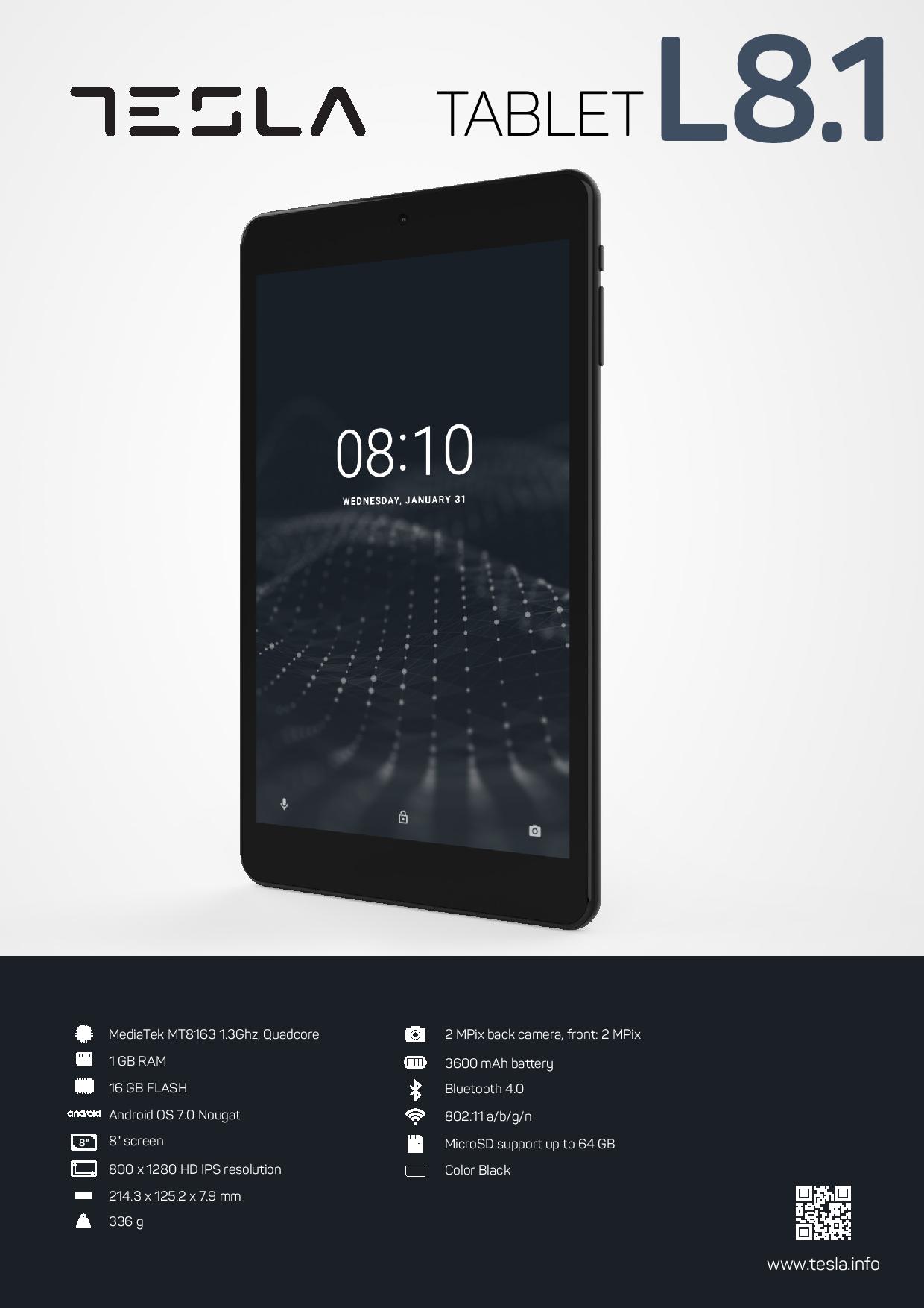 Tesla Tablet L8.1 donosi odličan odnos cene i kvaliteta, u paketu sa MediaTek Quad Core procesorom, Android 7.0 operativnim sistemom i podrškom za Mikro SD karticu kapaciteta do 64GB. Sve što očekujete od modernog i kvalitetnog tableta, Tesla Tablet L8.1 vam obezbeđuje po veoma povoljnoj ceni.