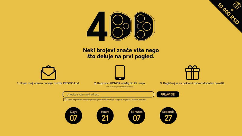 Nakon dobijanja promo koda, potrebno je obaviti kupovinu jednog od uređaja iz nove N serije – HONOR 400 ili HONOR 400 Pro – u periodu od 22. do 25. maja 2025. Svaki kupac, uz redovne poklone, stiče pravo na poklon karticu u iznosu od 10.000 RSD, koja će biti dostavljena na kućnu adresu.